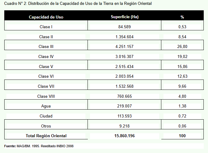 En términos de distribución, la mayor parte de la Región Oriental se concentra en tierras con limitaciones moderadas a severas. La Clase III representa el 26,8% del territorio y la Clase IV el 19,02%, mientras que las tierras óptimas (Clase I) apenas alcanzan el 0,53%. A partir de esta caracterización, el estudio propone una zonificación funcional del uso del suelo, distinguiendo áreas agrícolas, pecuarias, forestales y de conservación.