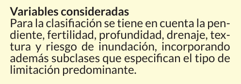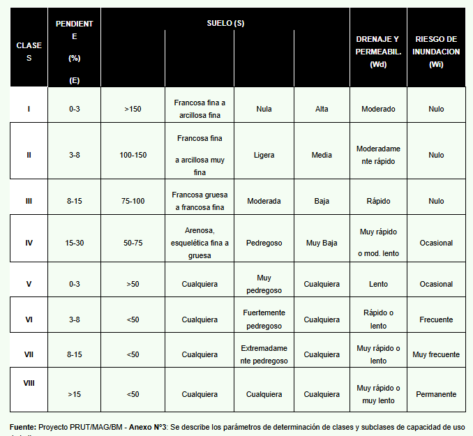 Partiendo de una base metodológica ampliamente validada a nivel internacional, el sistema de clasificación del Departamento de Agricultura de los Estados Unidos, que ordena las tierras en ocho clases (I a VIII) según sus limitaciones productivas, desde suelos con alta aptitud agrícola y mínimas restricciones (Clase I) hasta aquellos con limitaciones extremas que impiden cualquier uso productivo (Clase VIII). El sistema fue adaptado a la Región Oriental.